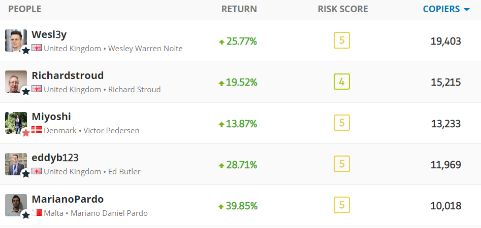 Tager man et kig på de 5 mest kopierede traders i skrivende stund, så kan man se, at de leverer et meget godt afkast. Risikoen er dog relativt høj, som du kan se i tabellen. Bemærk dog hvor mange mennesker der kopierer disse tradere, og du kan være den næste.