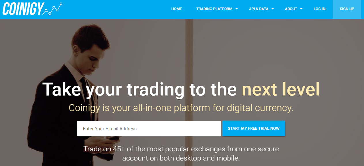 Det første trin er selvfølgelig, at du skal have en bruger inde på Coinigys hjemmeside. I forbindelse med vores Coinigy guide får du en prøveperiode på 30 dage: Opret konto hos Coinigy Det er meget simpelt, du indtaster bare din e-mail adresse i midten af siden og klikker på “Start My Free Trial Now”. Herefter modtager du en e-mail fra dem, hvor du skal bekræfte din e-mail. Du logger derefter ind og vælger en adgangskode. Tillykke, du har nu en bruger!
